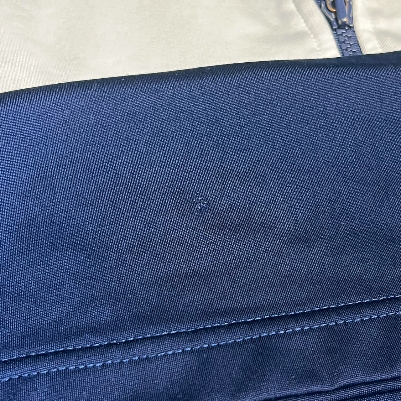 右裾後ろ白汚れ、裾微小穴、ジップ付近微汚れあり。