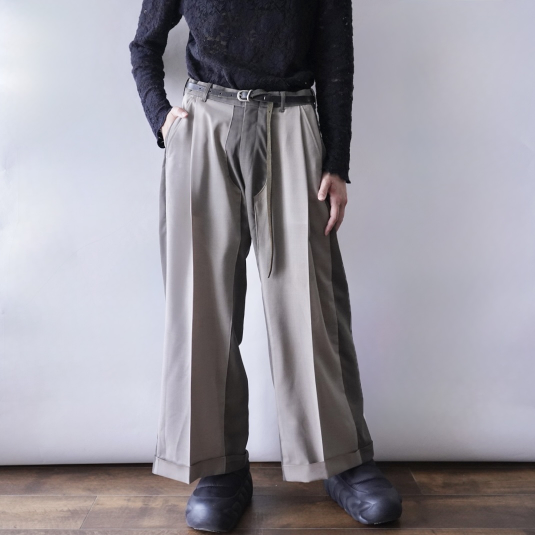 明るいトーンのベージュのスラックスを差し込んだワイドシルエット